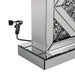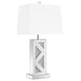 This statement-making table lamp features a rectangular base adorned with mirrored paneling and a bold chevron design inlaid with crushed crystal acrylic. A crisp white shade balances the shimmering base with a clean, structured silhouette. The geometric accents and reflective surfaces create a dramatic focal point for living rooms, bedrooms, or entryways. Designed to dazzle, this lamp adds ambient lighting with a touch of glam-inspired sophistication.