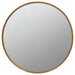 • Round wall mirror framed in a warm brass-tone metal for a clean, contemporary accent