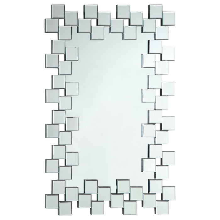 Add striking dimension to any room with this frameless wall mirror featuring a geometric mosaic edge. The center rectangular mirror is bordered by a dynamic pattern of staggered square tiles that reflect light and style from every angle. Ideal for modern interiors, this mirror doubles as a functional décor accent in entryways, bedrooms, or dressing spaces.