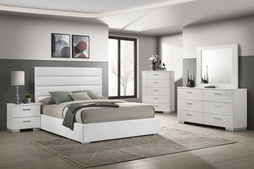 CoasterCrisp white high gloss and sculptural textures define this modern bedroom set, blending sleek surfaces with dimensional details. Geometric drawer f...