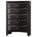 Transform your bedroom with this sophisticated storage bedroom set that combines timeless style and practical function. Finished in sleek black, the platform bed features four drawers in the footboard and hidden compartments behind drop-down doors on the headboard and side rails. The bookcase headboard includes four drawers and a center shelf for accessible storage. Complementary case pieces echo the look with chambered drawer fronts and brushed nickel hardware, creating a refined and cohesive space.