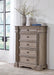 Details B916B5: Includes panel headboard, footboard with slats and rails, Made with hardwood solids, oak and ash veneer, cast resin components and engineered wood substrates, Tops with inlaid ash veneer border, Light warm grayish brown glazed wood finish, Breakfront pilasters, Inset picture frame panels, Headboard features light bridge with 2 overhead LED lights, Foundation/box spring required, sold separately , Mattress available, sold separately, Assembly required, B916B1: Includes dresser and mirror, Made with hardwood solids, oak and ash veneer, cast resin components and engineered wood substrates, Tops with inlaid ash veneer border, Light warm grayish brown glazed wood finish, Round metal knobs with satin nickel-tone finish, 10 drawers with fully finished interior, dovetail construction and ball-bearing side glides, Drawers with inset framed fronts, Dresser with breakfront pilasters, Mirror frame features light bridge with 2 mini LED lights, Mirror attaches to back of dresser, B916-46: Made with hardwood solids, oak and ash veneer, cast resin components and engineered wood substrates, Top with inlaid ash veneer border, Light warm grayish brown glazed wood finish, Round metal knobs with satin nickel-tone finish, 5 drawers with fully finished interior, dovetail construction and ball-bearing side glides, Drawers with inset framed fronts, Breakfront pilasters, B916-93: Made with hardwood solids, oak and ash veneer, cast resin components and engineered wood substrates, Top with inlaid ash veneer border, Light warm grayish brown glazed wood finish, Round metal knobs with satin nickel-tone finish, 3 drawers with fully finished interior, dovetail construction and ball-bearing side glides, Drawers with inset framed fronts, Breakfront pilasters, 110V power supply with dual USB charging ports, Power cord included; UL Listed,