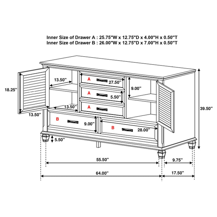 This magnificent 5-piece bedroom set from the Franco collection has chic styling and modern convenience. The imposing headboard and low footboard of the bed are crafted with detailed panels for an elegant look. The durable, roomy drawers on the nightstand, chest, and dresser are conveniently built with soft-closing guides. A handy pull-out service tray is built into the nightstand and includes easy cord access for recharging your gadgets. A large rectangular mirror that easily sits atop the dresser rounds out the set, each piece of which features a handsome finish that adds a rustic ambiance to the bedroom.