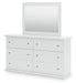 Details B139B42: Includes panel headboard/footboard and rails, Made with engineered wood (MDF/particleboard/plywood) and decorative laminate for the right balance of affordability and durability, Replicated solid white paint, Decorative laminate replicates natural or man-made material surfaces with consistent color, pattern and texture, Foundation/box spring required, sold separately, Mattress available, sold separately, Assembly required, B139B40: Includes dresser and mirror, Made of engineered wood (MDF/particleboard), Knobs with pewter-tone finish, Scalloped moulding, 6 smooth-operating drawers, Includes tipover restraint device, Mirror attaches to back of dresser; can also be mounted on wall horizontally or vertically, Safety is a top priority, clothing storage units are designed to meet the most current standard for stability, ASTM F 2057 (ASTM International), Drawers extend out to accommodate maximum access to drawer interior while maintaining safety, B139-91: Made of engineered wood (MDF/particleboard), Pewter-tone knobs, 1 smooth-operating drawer, 1 storage cubby, Scalloped moulding, Small Space Solution,