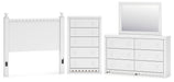 | Details | B2540-87: Made with engineered wood (MDF/particleboard/plywood) and decorative laminate for the right balance of affordability and durability, Matte white finish, Decorative laminate replicates natural or man-made material surfaces with consistent color, pattern and texture, ¼" bolts (not included) are needed to attach headboard to your existing bed frame, Minor assembly required, B2540-46: Made with engineered wood (MDF/particleboard/plywood) and decorative laminate for the right balance of affordability and durability, Matte white finish, Decorative laminate replicates natural or man-made material surfaces with consistent color, pattern and texture, Simple white knobs, 5 smooth-gliding drawers, Drawer interiors are lined with a faux linen laminate for a clean, finished look, Safety is a top priority, clothing storage units are designed to meet the most current standard for stability, ASTM F 2057 (ASTM International), Drawers extend out to accommodate maximum access to drawer interior while maintaining safety, Minor assembly required, B2540B1: Includes dresser and mirror , Made with engineered wood (MDF/particleboard/plywood) and decorative laminate for the right balance of affordability and durability, Matte white finish, Decorative laminate replicates natural or man-made material surfaces with consistent color, pattern and texture, Simple white knobs, 6 smooth-gliding drawers, Drawer interiors are lined with a faux linen laminate for a clean, finished look, Mirror can be attached to back of dresser or wall mounted horizontally or vertically, Safety is a top priority, clothing storage units are designed to meet the most current standard for stability, ASTM F 2057 (ASTM International) , Drawers extend out to accommodate maximum access to drawer interior while maintaining safety, Minor assembly required, | |