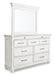 | Details | B777B9: Includes king panel headboard, storage bench footboard and rails, Made with solid wood, veneers and engineered wood, Distressed whitewash finish, Foundation/box spring required, sold separately, Mattress available, sold separately, Assembly required, B777B1: Includes dresser and mirror, Made with solid wood, veneers and engineered wood, Distressed whitewash finish, Dark gray pewter-tone finished metal hardware, 7 smooth-gliding drawers, plus 2 small-scaled accessory drawers, Mirror attaches to back of dresser, Assembly required, B777-46: Made with solid wood, veneers and engineered wood, Distressed whitewash finish, Dark gray pewter-tone finished metal hardware, 7 smooth-gliding drawers, | |