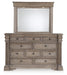 | Details | B916B2: Includes panel headboard, footboard with slats and rails, Made with hardwood solids, oak and ash veneer, cast resin components and engineered wood substrates, Tops with inlaid ash veneer border, Light warm grayish brown glazed wood finish, Breakfront pilasters, Inset picture frame panels, Headboard features light bridge with 2 overhead LED lights, Foundation/box spring required, sold separately , Mattress available, sold separately, Assembly required, B916B1: Includes dresser and mirror, Made with hardwood solids, oak and ash veneer, cast resin components and engineered wood substrates, Tops with inlaid ash veneer border, Light warm grayish brown glazed wood finish, Round metal knobs with satin nickel-tone finish, 10 drawers with fully finished interior, dovetail construction and ball-bearing side glides, Drawers with inset framed fronts, Dresser with breakfront pilasters, Mirror frame features light bridge with 2 mini LED lights, Mirror attaches to back of dresser, B916-46: Made with hardwood solids, oak and ash veneer, cast resin components and engineered wood substrates, Top with inlaid ash veneer border, Light warm grayish brown glazed wood finish, Round metal knobs with satin nickel-tone finish, 5 drawers with fully finished interior, dovetail construction and ball-bearing side glides, Drawers with inset framed fronts, Breakfront pilasters, | |
