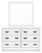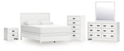 Details B427B6: Includes queen panel headboard, footboard, rails and slats, Made with hardwood solids, okoume veneer and MDF substrates, White finish, Foundation/box spring required, sold separately, Mattress available, sold separately, Assembly required, B427B1: Includes dresser and mirror, Made with hardwood solids, okoume veneer and MDF substrates, White finish, 6 drawers with dovetail construction and metal center guides, Hardware with dark finish, Drawer interiors are lined with a wood grain laminate for a clean, finished look, Mirror attaches to back of dresser, B427-46: Made with hardwood solids, okoume veneer and MDF substrates, White finish, 5 drawers with dovetail construction and metal center guides, Hardware with dark finish, Drawer interiors are lined with a wood grain laminate for a clean, finished look, B427-92: Made with hardwood solids, okoume veneer and MDF substrates, White finish, 2 drawers with dovetail construction and metal center guides, Hardware with dark finish, Drawer interiors are lined with a clean wood grain laminate for a clean, finished look,