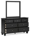 Details B687B2: Includes twin panel headboard, footboard and rails, Made with hardwood solids, birch veneer and MDF substrate, Black painted finish, Thick profiled tops, Tapered feet, Foundation/box spring required, sold separately, Mattress available, sold separately, Assembly required, Bed is compatible with an adjustable base, B687B1: Includes dresser and mirror, Made with hardwood solids, birch veneer and MDF substrate, Black painted finish, 7 smooth-gliding drawers with dovetail construction and ball-bearing side glides, Round metal drawer knobs with satin nickel-tone finish, Framed drawer fronts, Tapered feet, Mirror attaches to back of dresser, Assembly required,