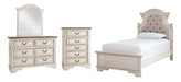 Details B743B12: Made of veneers, wood and engineered wood, with cast resin components, Antiqued two-tone finish, 6 smooth-gliding drawers with dovetail construction, Dark bronze-tone hardware, Mirror attaches to back of dresser, Assembly required, Includes tipover restraint device, B743B13: Made of veneers, wood and engineered wood, with cast resin components, Includes upholstered headboard, footboard and rails, Distressed, chipped white finish, Upholstered headboard with foam cushion, button tufting, Assembly required, Mattress and foundation/box spring available, sold separately, Bed is compatible with an adjustable base, B743-45: Made of veneers, wood and engineered wood, with cast resin components, Antiqued two-tone finish, 5 smooth-gliding drawers with dovetail construction (top drawer felt lined), Dark bronze-tone hardware,