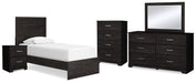 Belachime Twin Panel Bed with Mirrored Dresser, Chest and Nightstand