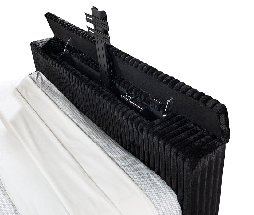 Unveil a new chapter of indulgence with this velvet wingback bed, where high style meets high tech. Richly upholstered in decadent black velvet, its vertical channeled frame embraces you in plush softness. Hidden within the footboard, a concealed TV lift fits up to 50-inch TVs and rises with the push of a button. A built-in power outlet with three AC ports adds plug-and-play convenience. This bed transforms any room into a sanctuary of luxury, beauty, and cinematic escape.