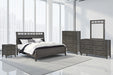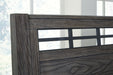 | Details | Includes queen panel headboard, rails and footboard with slats , Made with hardwood solids and MDF substrates, Medium gray-brown finish with a blackened wood grain contrast; embossed wood grain texture, Lay-back headboard , Decorative inset metal grille with matte black finish , Foundation/box spring required, sold separately, Mattress not included, sold separately, Assembly required | |