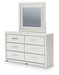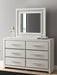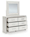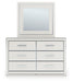Details Includes dresser and mirror, Made with engineered wood (MDF/particleboard/plywood) and decorative laminate for the right balance of affordability and durability, Matte white finish with subtle replicated wood grain, Decorative laminate replicates natural or man-made material surfaces with consistent color, pattern and texture , Chrome-tone accents, Large-scale chrome-tone handles with faceted details, 6 smooth-gliding drawers, Drawer interiors are lined with a faux linen laminate for a clean, finished look, Mirror attaches to back of dresser; can also be mounted on wall horizontally or vertically, Safety is a top priority, clothing storage units are designed to meet the most current standard for stability, ASTM F 2057 (ASTM International), Drawers extend out to accommodate maximum access to drawer interior while maintaining safety, Minor assembly required