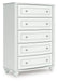Fit for a princess. This chest of drawers’ crisp matte white finish pairs with charming elements like bun feet, crystal knobs and ornate beading—the perfect crowning touches for your girly girl. This spacious five-drawer piece is sure to make your little one feel like royalty.