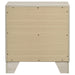 This contemporary two-drawer nightstand brings a chic blend of rustic and modern design to your bedside. Crafted with a rustic cream finish over rough-sawn, white-washed engineered paper veneer, it exudes a warm, textured appeal. Extra-wide polished nickel handles offer a sleek contrast to the rustic tones, adding a touch of sophistication. Built with engineered wood and featuring durable English dovetail joinery and Center metal glides, this nightstand is as functional as it is stylish, providing ample storage in a compact, modern silhouette.