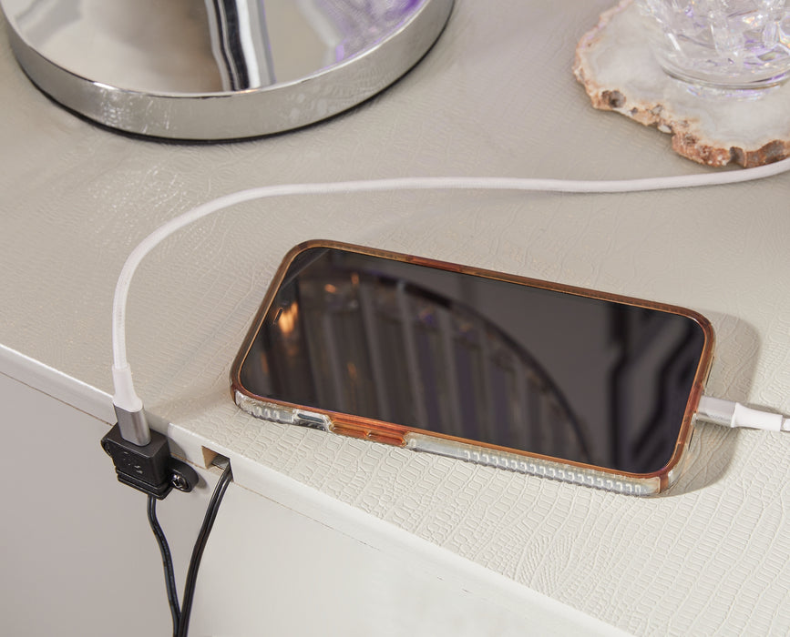 | Details | Made with engineered wood (MDF/particleboard/plywood) and decorative laminate for the right balance of affordability and durability, Silvertone pearl finished faux gator, Decorative laminate replicates natural or man-made material surfaces with consistent color, pattern and texture, Handles with faux crystal accents, 2 smooth-gliding drawers, Drawer interiors are lined with a faux linen laminate for a clean, finished look, Faceted chrome-tone details, USB and wireless charging options, Power cord included; UL Listed, Minor assembly required | |