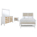 Textured rattan drawer fronts create a fresh, modern coastal aesthetic for this contemporary bedroom set. Offering ample storage and a clean look and feel, the set centers on a wooden bed with a gently flared, upholstered headboard with plush foam padding for easy comfort. The set includes a bright white finish, offering easy contrast to the rattan and linen-colored fabric upholstery that creates cool ambiance. Top drawers in the set include black felt lining and drawers are dotted with round metal knobs. The dresser includes a framed mirror while the nightstand offers both a drawer and a shelf for easy storage and decor.
