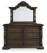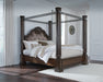 Details B947B10: Includes upholstered poster headboard panel, poster footboard panel, rails, slats, posts and canopy , Made with hardwood solids, oak veneer, MDF substrates and cast resin components, Dark brown finish, Metal canopy, Foam headboard cushion with polyester upholstery, Measure room, including ceiling height, to ensure bed clears fans and light fixtures, Foundation/box spring required, sold separately, Mattress available, sold separately, Assembly required, B947B1: Includes dresser and mirror, Made with hardwood solids, oak and ash swirl veneers, MDF substrates and cast resin components, Dark brown finish, 6 smooth-gliding drawers with dovetail construction (top drawer felt lined), Drawer pulls with antiqued goldtone finish, Mirror attaches to back of dresser,