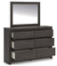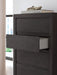 Details PCB3370B4: Includes headboard panel, headboard posts, storage footboard and rails, Made with engineered wood (MDF/particleboard/plywood) and decorative laminate for the right balance of affordability and durability , Dark charcoal finish over replicated oak grain, Decorative laminate replicates natural or man-made material surfaces with consistent color, pattern and texture, 2 smooth-gliding drawers in footboard, Foundation/box spring required, sold separately, Mattress available, sold separately, Assembly required, PCB3370B1: Includes dresser and mirror, Made with engineered wood (MDF/particleboard/plywood) and decorative laminate for the right balance of affordability and durability , Dark charcoal finish over replicated oak grain, Decorative laminate replicates natural or man-made material surfaces with consistent color, pattern and texture, Recessed hand grabs create hardware-less effect, 6 smooth-gliding drawers, Drawer interiors are lined with a faux linen laminate for a clean, finished look , Safety is a top priority, clothing storage units are designed to meet the most current standard for stability, ASTM F 2057 (ASTM International), Drawers extend out to accommodate maximum access to drawer interior while maintaining safety, Mirror attaches to back of dresser; can also be mounted on wall horizontally or vertically, Assembly required, PCB3370-46: Made with engineered wood (MDF/particleboard/plywood) and decorative laminate for the right balance of affordability and durability, Dark charcoal finish over replicated oak grain, Decorative laminate replicates natural or man-made material surfaces with consistent color, pattern and texture, Recessed hand grabs create hardware-less effect, 5 smooth-gliding drawers, Drawer interiors are lined with a faux linen laminate for a clean, finished look, Safety is a top priority, clothing storage units are designed to meet the most current standard for stability, ASTM F 2057 (ASTM International), Drawers extend out to accommodate maximum access to drawer interior while maintaining safety, Assembly required, PCB3370-92: Made with engineered wood (MDF/particleboard/plywood) and decorative laminate for the right balance of affordability and durability, Dark charcoal finish over replicated oak grain, Decorative laminate replicates natural or man-made material surfaces with consistent color, pattern and texture, Recessed hand grabs create hardware-less effect, 2 smooth-gliding drawers, Drawer interiors are lined with a faux linen laminate for a clean, finished look, 2 slim-profile USB-C charging ports, Power cord included; UL Listed, Assembly required,
