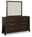 Details B618B2: Includes upholstered panel headboard, panel rails and panel footboard with slats, Made with hardwood solids, engineered wood and MDF substrates, Grayish brown wood-tone finish, Floating inset upholstered panel in polyester Next-Gen Nuvella fabric surrounded by LED backlight, Next-Gen Nuvella™ is a performance fabric that is soft, easy to clean, stain-resistant and durable, Clean fabric with mild soap and water, let air dry; for stubborn stains, use a solution of 4 oz. bleach to 28 oz. water, Light switch is located on each side of headboard and includes dual USB charging port (USB-A and USB-C), Power cord included; UL Listed, Foundation/box spring required, sold separately, Mattress available, sold separately, Assembly required, B618B1: Includes dresser and mirror, Made with hardwood solids, engineered wood and MDF substrates, Grayish brown wood-tone finish, Metal bar pulls with satin nickel-tone finish, 6 smooth-gliding drawers with dovetail construction and heavy duty ball-bearing side glides (top drawers felt lined), Mirror attaches to back of dresser, B618-46: Made with hardwood solids, engineered wood and MDF substrates, Grayish brown wood-tone finish, Metal bar pulls with satin nickel-tone finish, 5 smooth-gliding drawers with dovetail construction and heavy duty ball-bearing side glides (top drawers felt lined), B618-92: Made with hardwood solids, engineered wood and MDF substrates, Grayish brown wood-tone finish, Metal bar pulls with satin nickel-tone finish, 2 smooth-gliding drawers with dovetail construction and heavy duty ball-bearing side glides (top drawers felt lined),