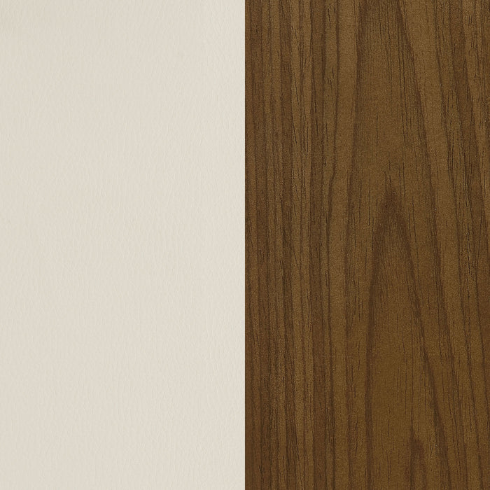 • Upholstered in a soft, ecru leatherette and accented by natural tones of walnut, it blends effortlessly with most any style of decor