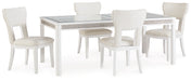 | Details | D822-35: Made with solid wood components, MDF substrate and decorative PVC laminate, Bright white lacquer finish, Tabletops feature rhinestone and textured PVC framing with glass panels, Rhinestone accent trim, Seats up to 10, Removable center leaf, Table extends by pulling both ends and dropping in leaf, Assembly required, D822-01: Made with solid wood frame, Bright white lacquer finish, Polyester upholstery, Foam cushion, Legs with adjustable levelers, Assembly required, | |