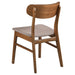 Indulge in a love of Euro-inspired fare that suits your discerning interior design requirements. This modern five-piece dining set is suited to both contemporary and transitional spaces, bridging motifs creating carefree aesthetics. Walnut finish rubberwood construction is sturdy without overly chunky, maintaining the clean lines you like to see. This set features a rectangular table with a straight edge top and rounded corners, as tapered legs are flush mounted as exterior side accents. Retro influence creates four chairs with curved backrests and nicely padded seat cushions upholstered with soft brown fabric.