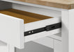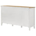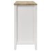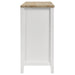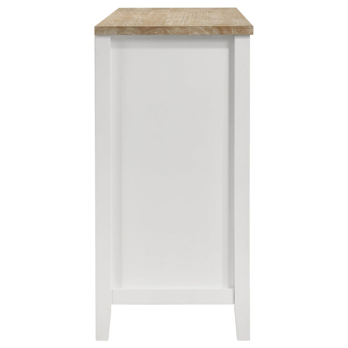 Wire brushing adds the perfect hint of rustic distressing to the table top featured on a modern farmhouse sideboard. Its two-tone look adds charm in a kitchen or dining room, with a natural wood top and crisp white base that adds contrast while maintaining a neutral color palette. Two drawers are ideal for utensils and delicate items with felt lining in a light brown hue. Two side cabinets add glass doors for showing off cookbooks, crockery or glassware. In the center, one open shelf and an X-cross bottle rack add a perfect spot for favorite bottles of wine and stylish decor that brings a personal touch.