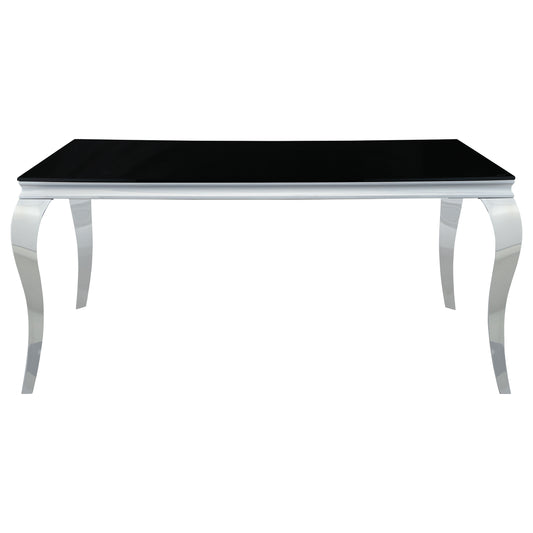 This dining table brings modern elegance with a dramatic twist. Its tempered glass top offers a sleek and durable surface, supported by a sculptural stainless steel base. Queen Anne cabriole legs lend classic flair, while the electroplated chrome finish delivers a mirror-like shine. Available with a white or black glass top, this table blends traditional shapes with contemporary materials for a bold dining centerpiece.