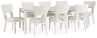 Details D822-35: Made with solid wood components, MDF substrate and decorative PVC laminate, Bright white lacquer finish, Tabletops feature rhinestone and textured PVC framing with glass panels, Rhinestone accent trim, Seats up to 10, Removable center leaf, Table extends by pulling both ends and dropping in leaf, Assembly required, D822-01: Made with solid wood frame, Bright white lacquer finish, Polyester upholstery, Foam cushion, Legs with adjustable levelers, Assembly required,