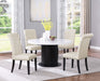 Transform a contemporary dining room with this modern, round dining table, designed with a lustrous, white, cultured marble, table top and a rustic espresso finished pedestal base for a contrasting look. Spacious enough to seat four people comfortably, this beautiful dining table features a 54-inch round table top of thick cultured marble that rests on a grounded, round pedestal base, providing a balanced and sophisticated silhouette to dining room spaces.