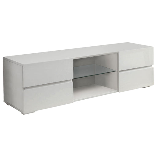 CoasterElevate your entertainment realm with our sleek, modern TV stand. With a pristine glossy white finish and clear glass accents, it exudes elegance. ...