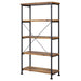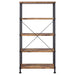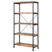 • Four-shelf bookcase with rustic nutmeg finish and open industrial styling