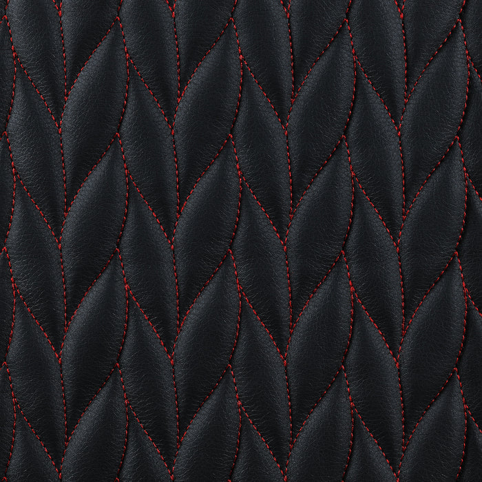 • Contemporary office chair wrapped in black leatherette with botanical-inspired herringbone pattern and red stitching details for a bold statement piece
