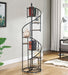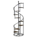 A unique black bookcase in a spiral design is sure to make your heart sing. Eight open shelves cascade down the frame of this rustic and industrial piece. The frame is crafted from metal with a black finish. The triangular shelves are finished in a warm wood color for contrast. Instantly enhance living areas and offices with this black rustic bookcase.