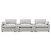 This three-seat home theater seating set combines modern convenience with plush comfort. Each power recliner offers smooth adjustability, while two center consoles feature lift-top storage and dual stainless steel cup holders. Upholstered in soft fabric, the generously padded cushions and pillow-top armrests enhance relaxation. Built for durability and long-lasting support, this seating arrangement is perfect for creating a cozy entertainment space.