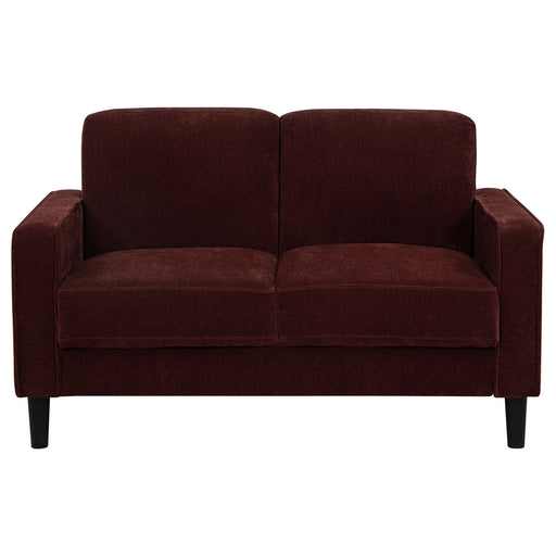 CoasterModern lines and plush comfort come together in this upholstered loveseat, designed for relaxed refinement. A engineered wood frame in a rich coffe...