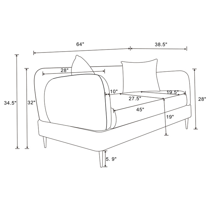 Enhance your living space with the modern elegance of this loveseat, designed to offer style, comfort, and functionality. Its sculpted round shapes and bench waterfall seat cushion provide a harmonious and inviting look, making it a perfect addition to any room. The loveseat is upholstered in textured chenille fabric, which is incredibly soft to the touch and adds a layer of luxury and durability. The rich green hue, paired with vivid yellow and neutral beige accent pillows, creates a balanced and vibrant look. Thin, tall metal legs support the loveseat, giving it a light and airy appearance while adding a modern touch.