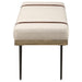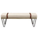 • Upholstered bench features beige fabric and decorative leatherette strap accents