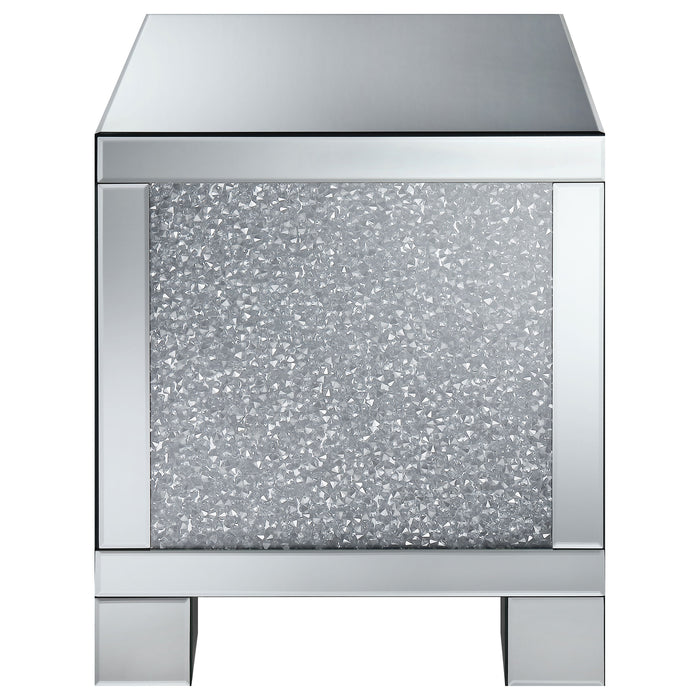 This 20-inch square mirrored end table brings a touch of glam to any space. Its engineered wood frame is adorned with shimmering acrylic crystal accents, adding sparkle and elegance. Fully mirrored surfaces enhance light and dimension, while the clean, square silhouette delivers sleek, contemporary style. Perfect as a functional or decorative piece, this table elevates your living room with luxurious glamor.