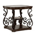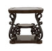 This elegant end table brings a blend of classic style and practicality to any living space. The clear tempered glass top offers a durable and polished surface, complemented by ornate scrollwork on the dark bronze powder-coated metal legs. The dark merlot finish highlights the engineered wood and cherry veneer construction, while the small middle shelf adds functionality with a polished wooden surface. Perfect for enhancing your living room with timeless charm and versatile utility.
