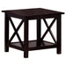 This 3-piece occasional table set includes a coffee table and two end tables, ideal for a living room or lounge. Constructed from hardwood, engineered wood, and rubberwood veneer, this set showcases a rich dark merlot finish. Each piece is designed with a lower shelf for extra storage space, while the X-shaped accents on the sides add a touch of visual appeal. This coffee table set is a perfect combination of form and function for your home.