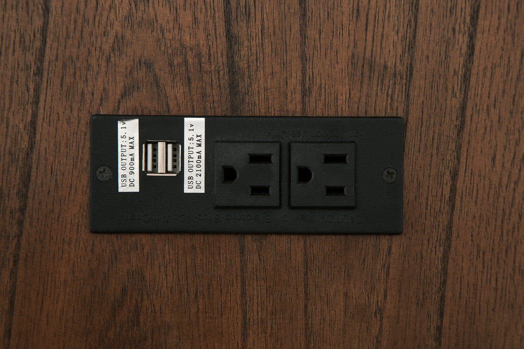 Details Made with solid wood, wood veneer and MDF substrate, Brown wood-tone finish, Table features storage cabinet, open cubby shelf and pull-out tray, 110V power supply with dual USB charging ports, Power cord included; UL Listed, Due to the use of natural materials, some variations may occur, Assembly required