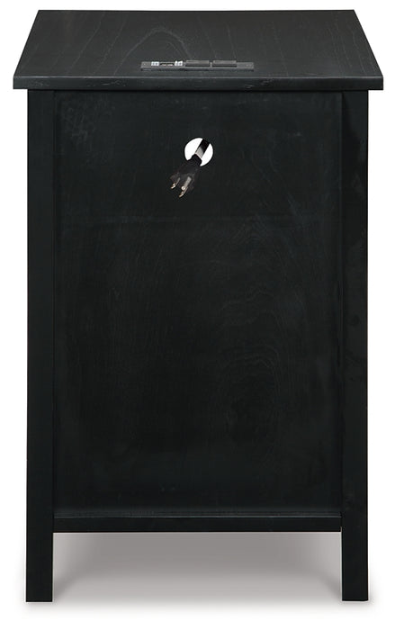 Add big character to a small space with this chairside end table. With its compact size and strong silhouette, it can go anywhere and blend easily into the decor. Less is so much more with the Shaker-inspired design and black wood tone finish. Loaded with form and function, this end table displays accent pieces and stores essentials securely while keeping devices powered up.