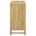 Infuse your space with the organic beauty of this global-inspired accent cabinet, crafted from eco-friendly mango wood in a warm natural finish. The three cabinet doors feature woven cane panels, adding a retro touch while allowing for subtle ventilation. Antique brass-finished knobs offer a refined contrast, enhancing the cabinet’s timeless appeal. The spacious interior with shelving provides ample storage for dining essentials, entryway organization, or living room decor. With clean lines, rounded edges, and a light wood tone, this cabinet blends modern simplicity with earthy charm.