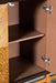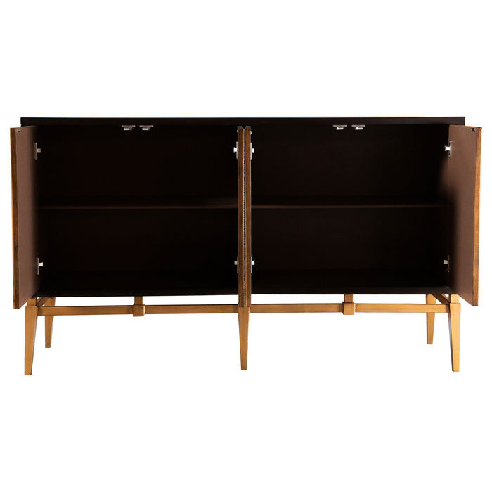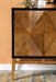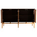 Bold texture and dynamic form converge in this four-door accent cabinet featuring a hand-applied sunburst motif. The intricate radial design is crafted with layered wood strips, framed in a rich brown outline and contrasted by a golden base. Angled, tapered legs enhance the silhouette, while magnetic door closures keep the look clean. Perfect for storing serveware or everyday essentials in the entryway, living room, or dining space.