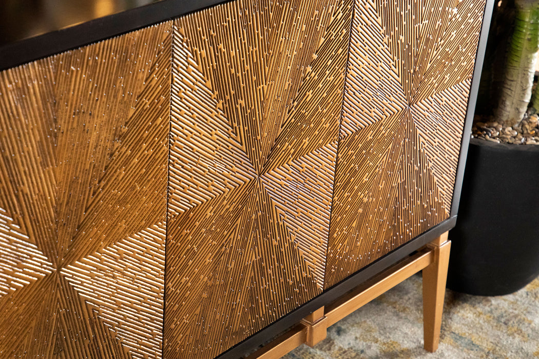 • Four-door accent cabinet with hand-crafted sunburst texture across each panel
