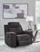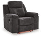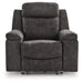 Seamlessly blend contemporary aesthetics and uncompromising comfort with this recliner. Its handsome charcoal-hued faux leather has a tailored appeal thanks to sizable stitching details. As for modern convenience? The simple one-pull reclining and ambient LED lighting encourage you to relax in style.