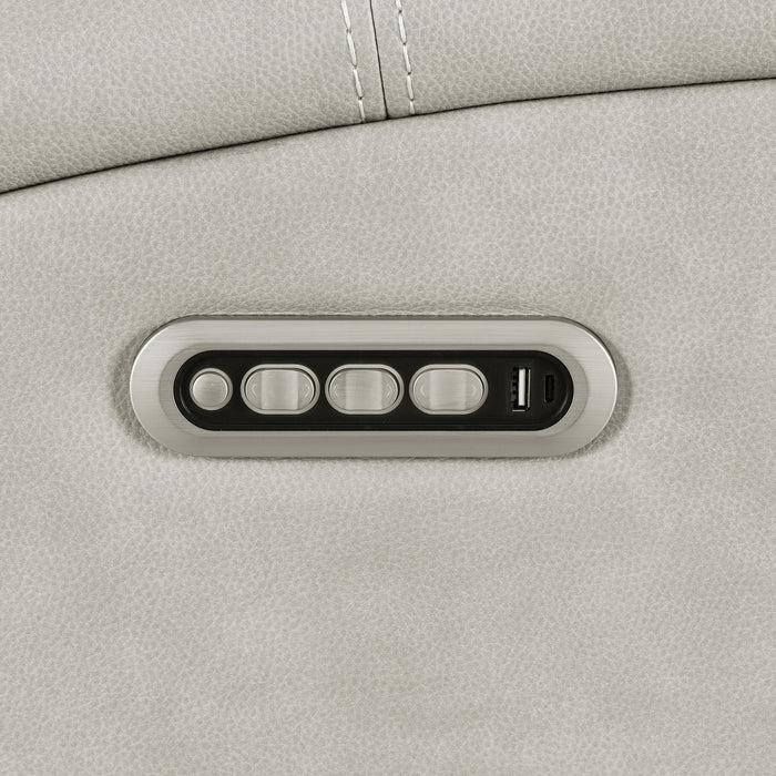 This triple power recliner chair invites you to unwind with motion, support, and quiet luxury. Wrapped in soft leatherette upholstery, it offers a supple touch that enhances every moment of rest. A gliding and swivel base flows effortlessly while plush cushions and contouring lumbar support cradle the body. Power headrest, lumbar, and zero gravity recline functions adjust at your command. Hidden cup holders and built-in USB A and USB C ports add thoughtful convenience, while an emergency power-down port offers peace of mind.